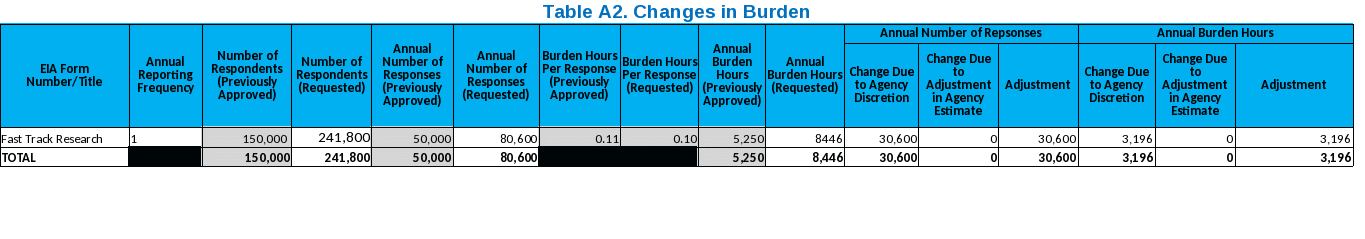 The increase in the burden hour estimate from 5,250 hours to 25, 340 hours (8,446 hours annually) reflects current growth in program needs and to correct an administrative error where 5,250 hours was entered into the ROCIS system instead of the correct number of 15,750 hours. The actual increase, if the data entry error had not occurred, would show from 15,750 hours to 25,340 hours. The growth in program needs is reflected by the increase in the number of customer satisfaction surveys from one in 2015 to nine in 2017. The number of responses used in some of those online surveys also increased and in one case the sample size exceeded 20,000 responses for a single customer satisfaction survey in 2017. Program offices are encouraged to use customer satisfaction surveys to show the practical utility and document the use and purpose of their survey data. The burden time is small for each response. The increase in responses from 150,000 to 241,800 and increase in burden hours from 5,250 to 25,340 are mainly due to the increased use of customer satisfaction surveys to understand how customers are using EIA survey data.
