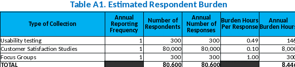 A variety of instruments and platforms will be used to collect information from respondents. The annual burden hours requested are based on the number of collections we expect to conduct over the requested period for this clearance. The total burden hours requested is 25,340 and 241,800 responses are based on the number of collections we expect to conduct over the requested three year approval period for this clearance.