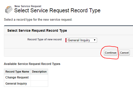 The Select Service Request Record Type page is displayed. Leave the default Record Type of “General Inquiry” and click the Continue button.