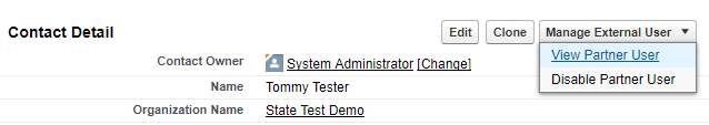 This displays the Contact Detail Page. Select View Partner User from the Manage External User drop-down.