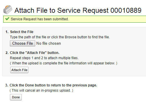 Click the Submit & Add Attachment button, which gives you the option to add attachments to the Service Request prior to submission. The Attach File to Service Request page is displayed. It provides the unique Service Request ID for your submission (i.e., 00010889 in the example below).