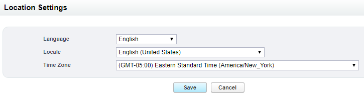 This displays the Location Settings option. Select the relevant time zone from the drop-down and click Save.