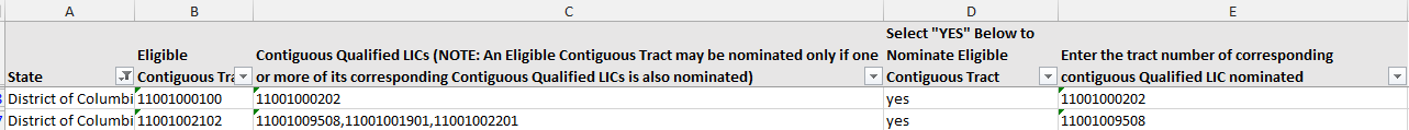The example below shows that a user has selected the State “District of Columbia” (using the Filter in the red square below and typing the name of the State in the text box) and has nominated census tracts 11001000100 and 11001000202 by typing the word “YES” in Column D. In addition, for the nomination of census tract 11001002102, the user identified census tract 11001009508 in Column E as the contiguous LIC Tract that is also being nominated and has been selected in the “1) LICs” worksheet.
