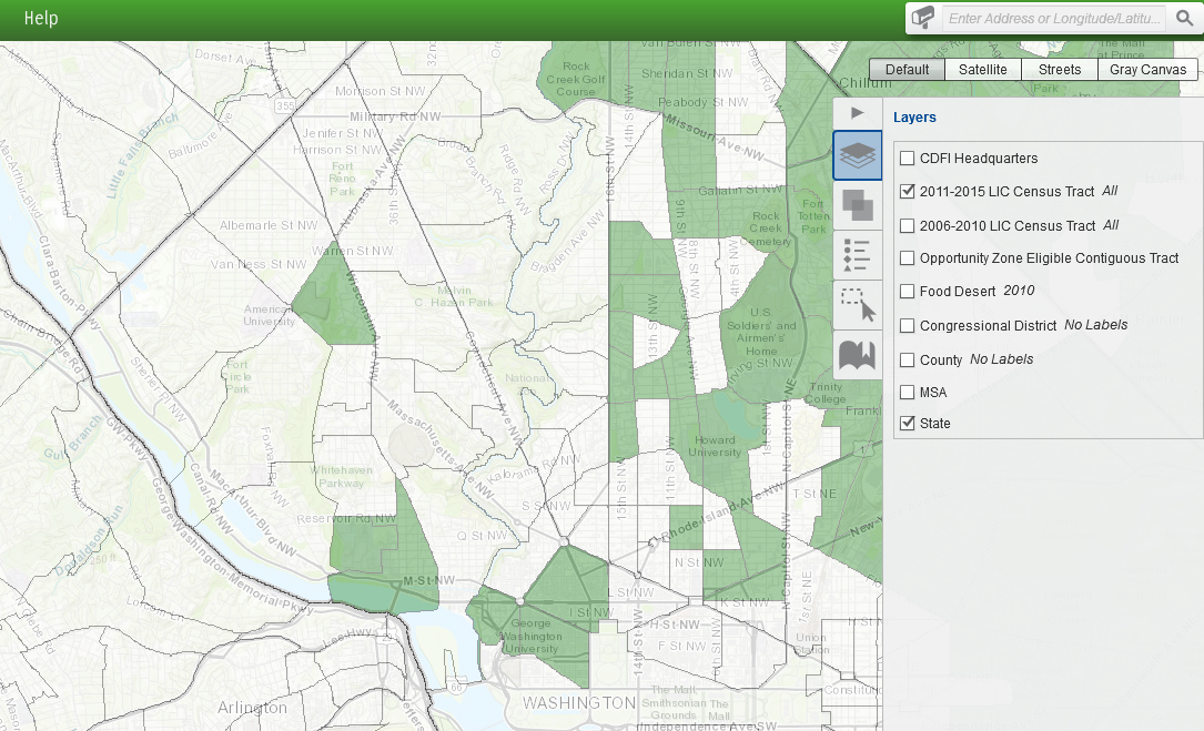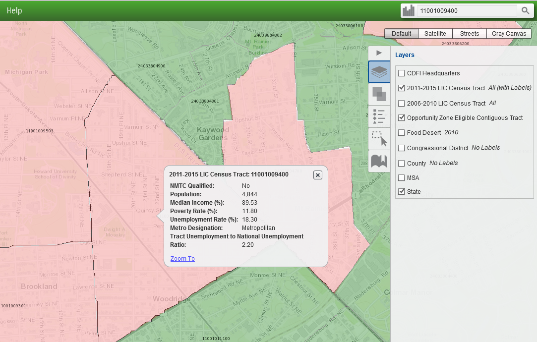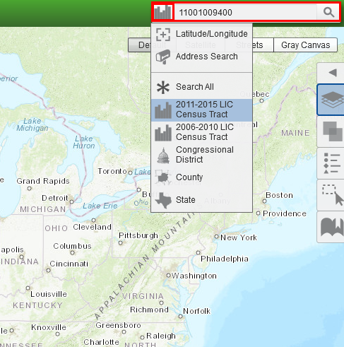 To select and zoom in to a specific census tract, click on the mailbox on the left side of the search bar and select “2011-2015 LIC Census Tract.” Enter one of the 11-digit census tract numbers for a LIC Tract or Eligible Non-LIC Contiguous Tract, found in the Nomination Tool. In the example below, census tract 11001009400 in the District of Columbia was entered in the search bar and 2011-2015 LIC Census Tract was selected. After clicking on magnifying glass, one tract was found.