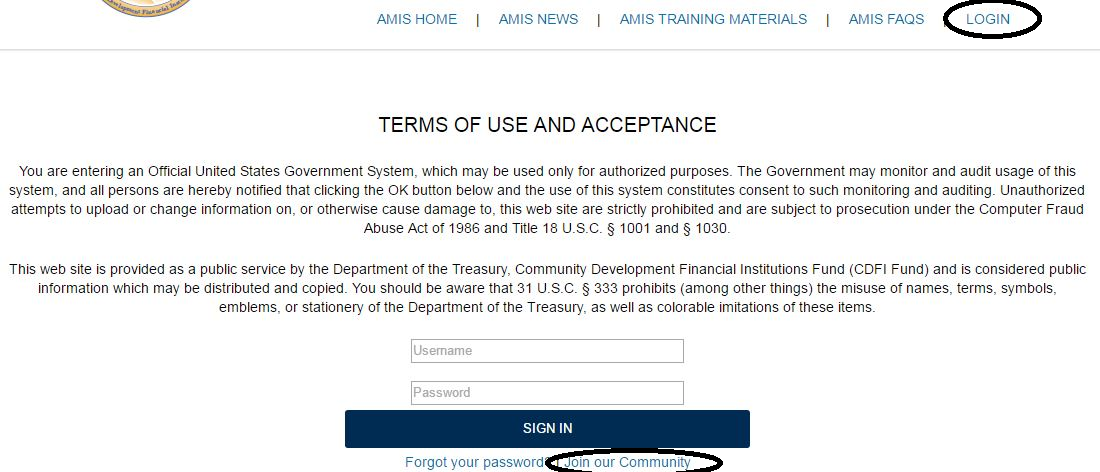 To register a new organization in AMIS, the registering user accesses the AMIS Landing Page and selects the login tab in the top right corner. This will display the AMIS “Terms of Use and Acceptance” and the text boxes for logging into AMIS.