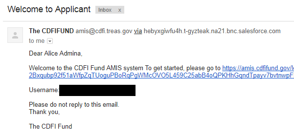 The registering user completes and submits the registration form, including Organization Name, First and Last Name of the Contact, the Organization’s EIN, and the email address for the Authorized Representative. Upon submission, AMIS displays a “Thank you for registering” message and sends the following “create password email message” to the email address provided on the registration form. Note that the email address must be unique within AMIS. The AMIS Username for the registering user is the user’s email address with four digits appended to it. The Username is included in the email message.