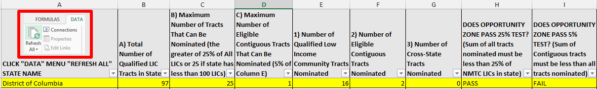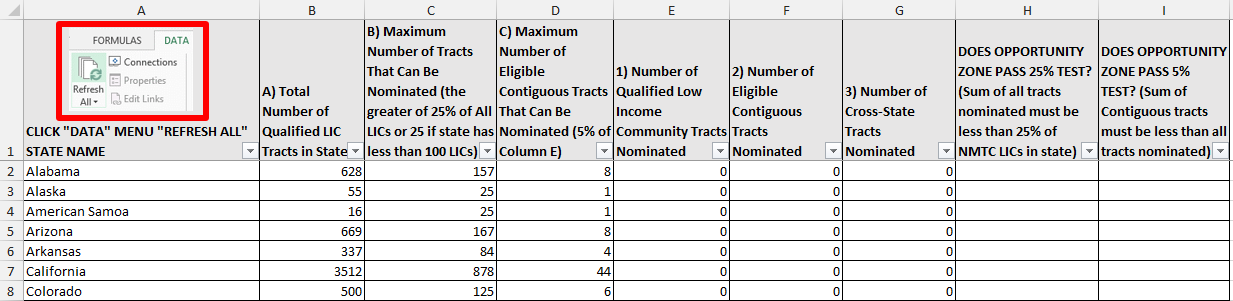 After the State selects its nominations by completing the worksheets in the Nomination Tool, the nomination can be tested by returning to the Summary worksheet and clicking the “Refresh All” button in the “Data” tab in the menu ribbon. The Summary table will then indicate the number of LIC Tracts and Eligible Non-LIC Contiguous Tracts nominated and whether the nomination falls within the statutory limits.