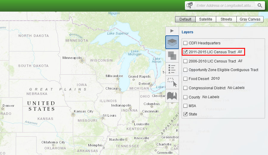 To view LICs, click on the “Layers” tab on the menu on the right hand side of the screen and select “2011-2015 LIC Census Tract.”