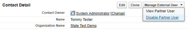 This displays the Contact Detail Page. Select Disable Partner User from the Manage External User drop-down.