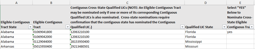 The example below shows that a user selected the State “Alabama” (using the Filter in the red square below and typing the name of the state in the text box) and nominated census tract 01069041800 in Alabama by typing the word “YES” in Column E and 12063210100 in Colum F. For this tract to be eligible for nomination, the State should confirm that Florida has also nominated the LIC Tract 12063210100.