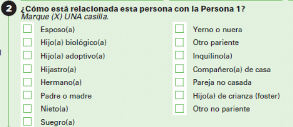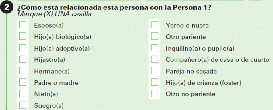 In further usability testing for the 2015 Content Test Internet Self-Response Instrument3, we found similar results. Some respondents interpreted “compañero…de cuarto” [roommate] to mean that the two people literally shared a room. This understanding is problematic, since the term “roommate” in English does not have the same specificity. This more narrow interpretation of the Spanish translation for “roommate” may prevent respondents living in roommate situations from selecting this category. Also in this round of testing, some respondents had difficulty with this question because they did not perceive a difference between “compañero de casa o de cuarto” [housemate or roommate] and “inquilino” [renter], which is a new translation for the “roomer/boarder” category. One respondent said that “inquilino” [renter] and “compañero de casa o de cuarto” [roommate/housemate] were the same. Another respondent indicated that housemates/roommates share other rooms of the house but other nonrelatives were like renters but not like roommates. A third respondent said an “inquilino” [renter] is someone who pays rent for living in someone’s house, and housemate/roommate is different because they may not pay rent. The final recommendation from this testing was to delete the term “de cuarto” from the housemate/roommate category, as “compañero de casa” [housemate] is understood broadly to include people who share a housing unit and contribute toward the rent without specifying that they share a room.