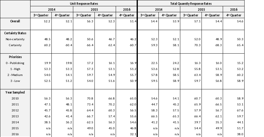 Also beginning for 2015 Q4, the Census Bureau released a new template for mailout documents. One of the most significant negative effects on response rates in the QPC survey results from the fact that response to the QPC survey is voluntary. The Census Bureau has always required that all voluntary surveys state somewhere in the mailout documents that response to the survey is voluntary. Prior to 2015 Q4, the QPC survey included this statement in the survey instructions, a less prominent location. However, the new template for mailout documents, implemented for the QPC survey in 2015 Q4, specified that this statement about voluntary reporting must be included in the first paragraph of the survey letter located at the front of the mailout documents. This change, combined with the transition to electronic-only reporting for the QPC survey, contributed to a drop in our survey unit response rates. Prior to these changes, our unit response rates were around 55%. After these changes, our unit response rates dropped to just around 50%. Despite the drop in our unit response rates for the QPC survey, the quality of our estimates remains high, considering we publish rates and not level estimates.