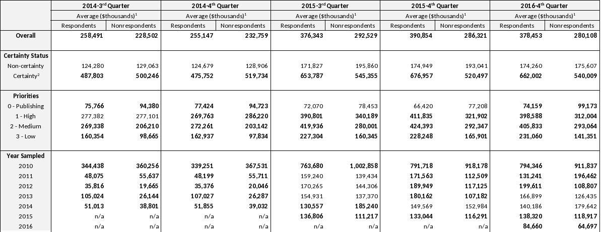 When we examine differences in average measure of size between respondents and nonrespondents for analysis subgroups based on industry priority, we generally see that these differences are statistically significant as well, with just a few exceptions. Appendix B shows that the only analysis subgroups that do not have a significant difference in average measure of size between respondents and nonrespondents are the high priority industries for 2014 Q3 and the publishing industries for 2015 Q3 and 2015 Q4. Due to the nature of establishments in the publishing industries, the average measures of size for respondents and nonrespondents are much smaller for the publishing industries than for the other industry priority subgroups for all reference quarters.