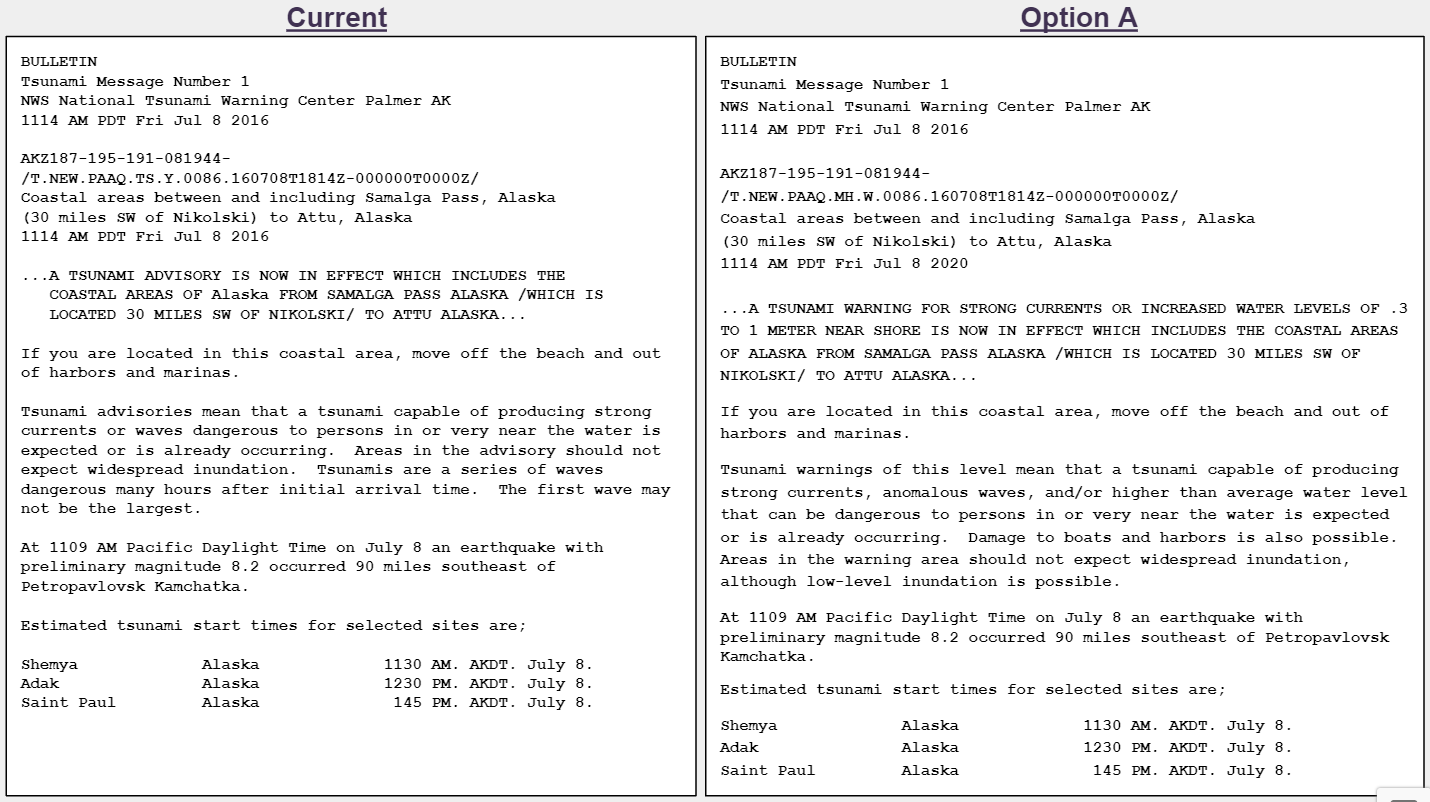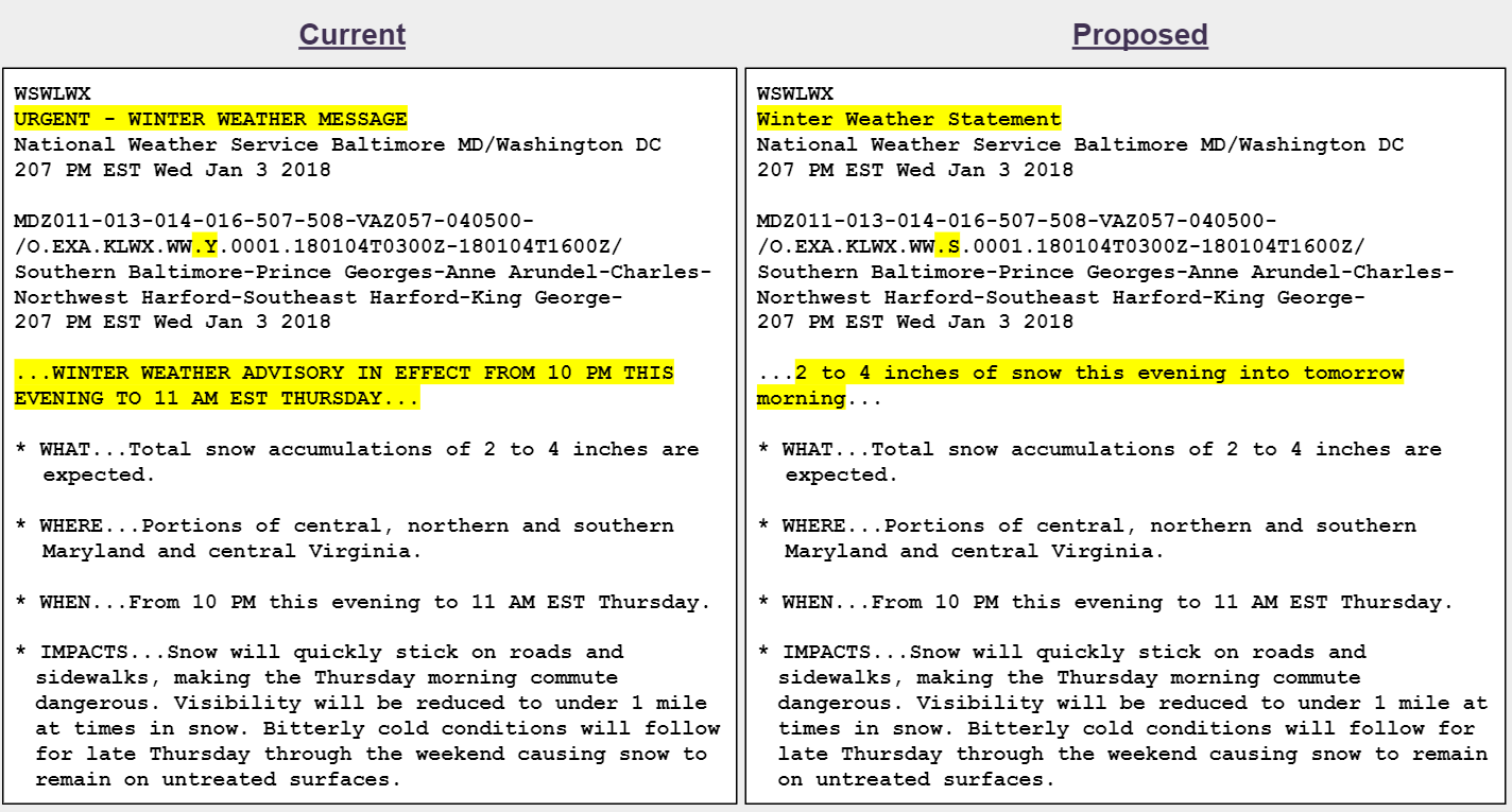 For decades, the National Weather Service (NWS) has used the "Watch, Warning, and Advisory" (WWA) system to make users aware of expected weather and water hazards. Social science research with NWS meteorologists, core partners, and the public has found that these three WWA terms can be misunderstood and/or confused. Based on this research, we are now proposing changes to the WWA system. In this survey, we’re asking for your feedback on the proposed changes.