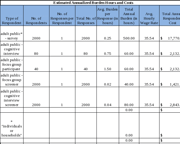 The maximum number of respondents each year will be 6,120 for the total of all quantitative surveys (2,000 respondents), cognitive interviews (80 respondents), focus groups (40 respondents), adult public focus group screener (2,000 respondents), and adult public cognitive interview screener (2,000 respondents). The collections will be conducted every year and the approved period will cover three years.