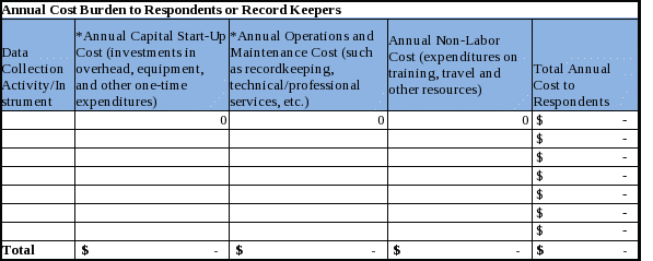 Provide an estimate of annualized cost to respondents for the hour burdens for collections of information, identifying and using appropriate wage rate categories. NOTE: The wage-rate category for each respondent must be multiplied by 1.46 and this total should be entered in the cell for “Avg. Hourly Wage Rate.” The cost to the respondents of contracting out or paying outside parties for information collection activities should not be included here. Instead, this cost should be included in Item 13.