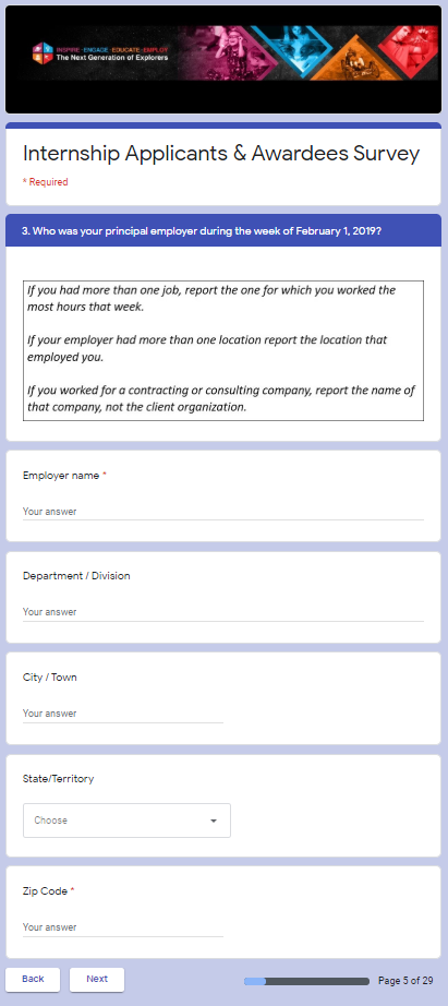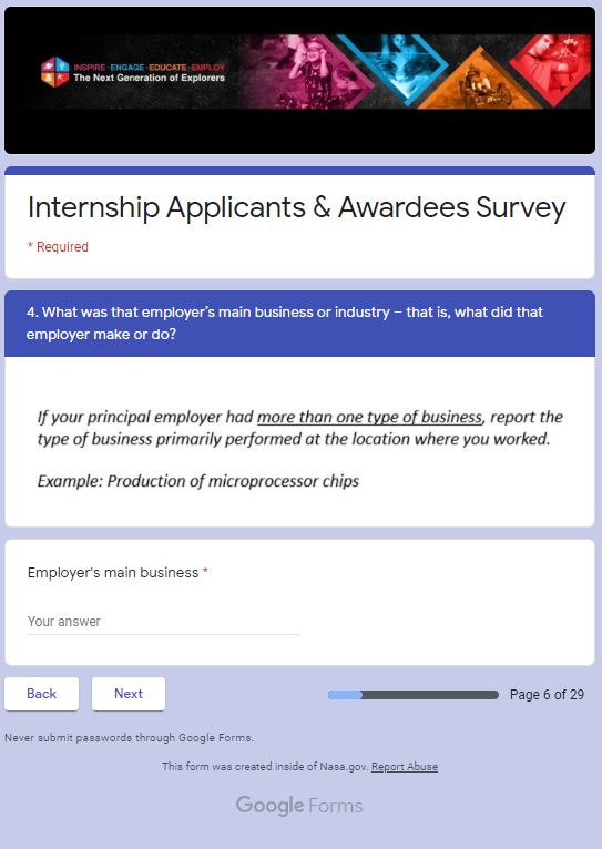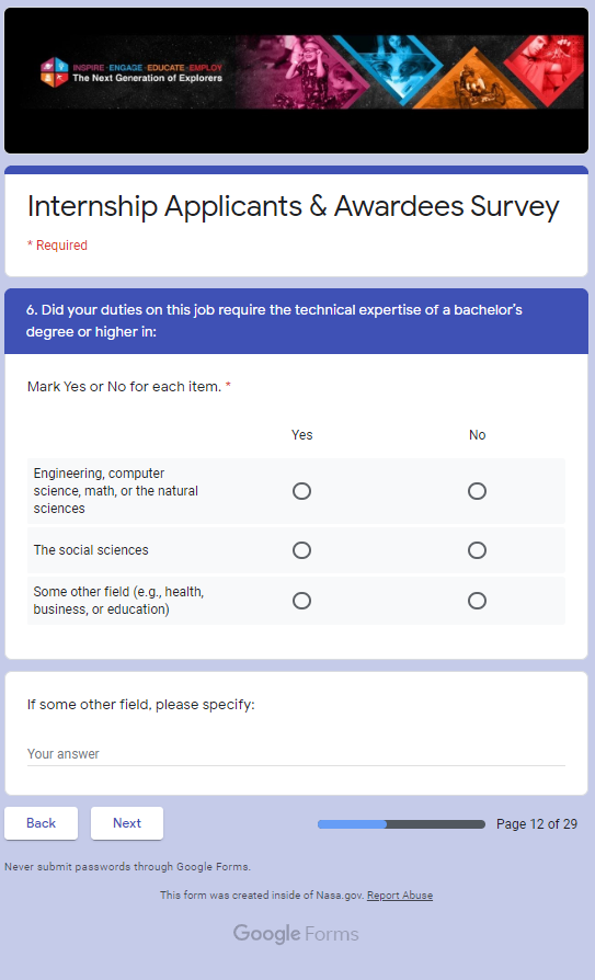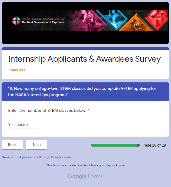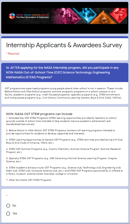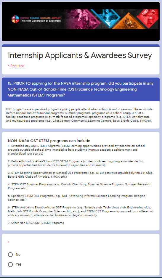NASA STEM Engagement Internship Applicants and Awardees Survey Screenshots