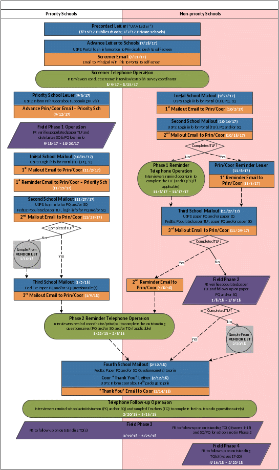 Private School Test. In NTPS 2017-18, NCES conducted an embedded test with private schools both to determine whether sufficient response could be achieved to provide reliable estimates for private schools and to evaluate specific methods for improving response rates. The private schools selected for this test experienced data collection procedures that were generally similar to those used with the NTPS 2017-18 public school sample. Some procedures were adjusted to accommodate differences specific to this sector (e.g., religious holidays and schedules). Preliminary results indicate that the private school data collected during NTPS 2017-18 will yield publishable estimates; however, our evaluation of the data will not be completed until after NTPS 2017-18 data collection period ends. The final results will be provided in the NTPS 2019-20 Main Study data collection submission in December 2018.