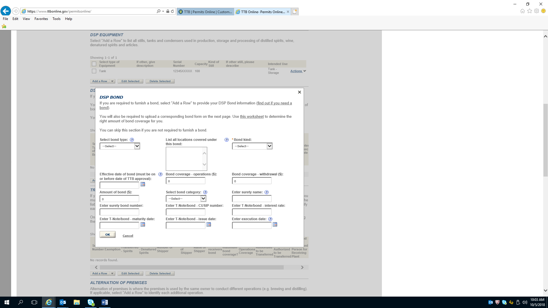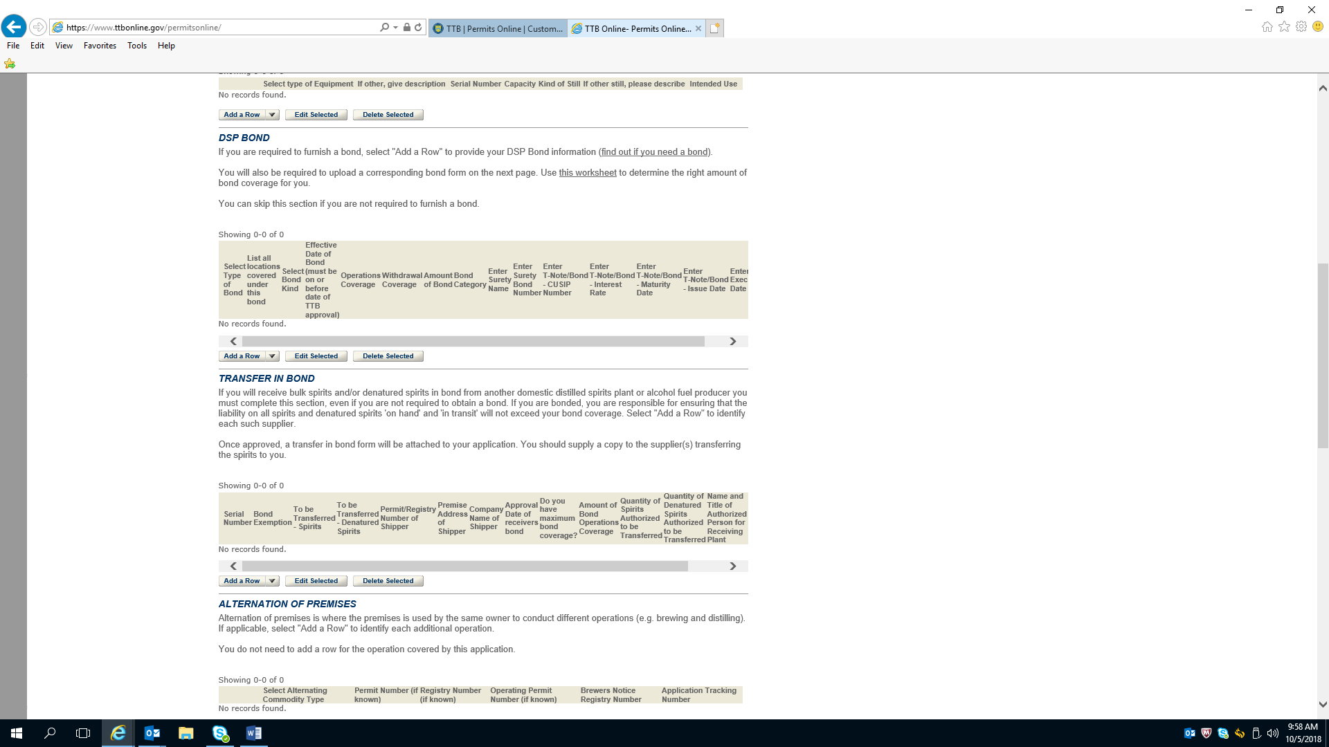 Permits Online (PONL) Screen Shots — Distilled Spirits Plant Operating Permit, OMB Control No. 1513–0040 (10-2018)