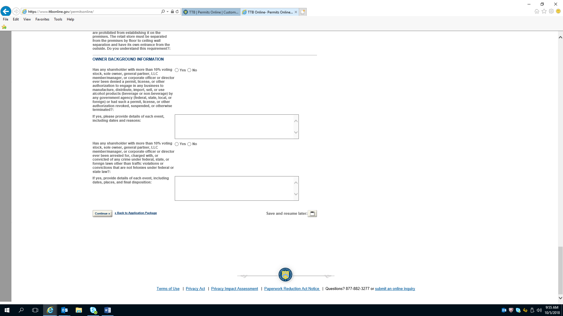 OMB No. 1513–0040, Application for Operating Permit under 26 U.S.C. 5171(d), is included within the Distilled Spirits Plant Application portion of TTB’s “Permits Online” system (PONL) at https://www.ttbonline.gov/permitsonline/. This PONL application is equivalent to form TTB F 5110.25. Screen shots for the Distilled Spirits Plant Operating Permit Application follow: