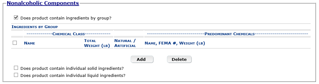 Formula Tab – Nonalcoholic Components – Ingredients by Group