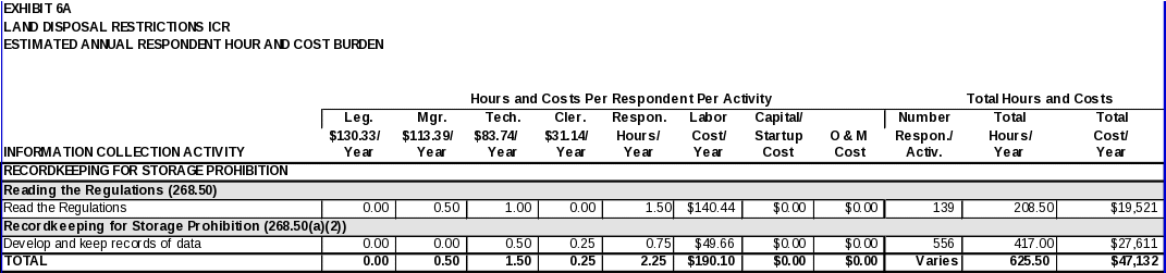 Based on RCRAInfo, EPA estimates that there are 1,403 TSDFs in operation. Based on its best judgment, EPA estimates that, each year, 10 percent of these facilities will store restricted hazardous wastes under 40 CFR 268.50. These facilities are expected to read the regulations at section 268.50.