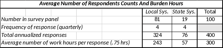 The survey universe consists of a panel of the 100 largest public retirement systems as determined by their total cash and security holdings reported in the 2012 Census of Governments. Conversations with respondents indicate the average number of work hours required per response is .75 hours, or 45 minutes. The estimated total quarterly burden would be 75 hours or 300 hours annually.