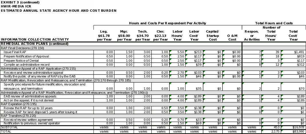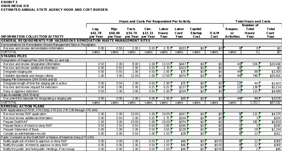 Thirty eight (38) States are authorized for the HWIR program, with an additional four (4) States expected to be authorized over the next three years. EPA estimates the State Agency hour and cost burden associated with all information collection requirements covered in this ICR in Exhibit 3.