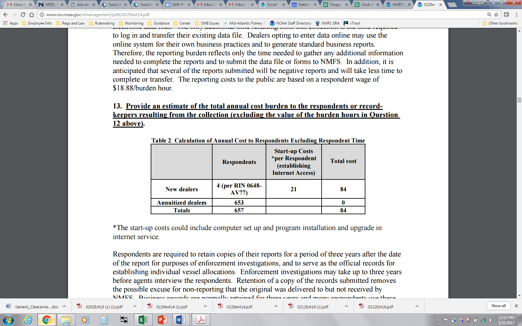 As indicated in Table 1, the total annual reporting burden associated with this collection is estimated at 2,278 hours. This burden assumes an average response time of 4 minutes to submit electronic data files. The only additional time resulting from this collection is the time required to log in and transfer their existing data file. Dealers opting to enter data online may use the online system for their own business practices and to generate standard business reports. Therefore, the reporting burden reflects only the time needed to gather any additional information needed to complete the reports and to submit the data file or forms to NMFS. In addition, it is anticipated that several of the reports submitted will be negative reports and will take less time to complete or transfer. The reporting costs to the public are based on a respondent wage of $18.88/burden hour.
