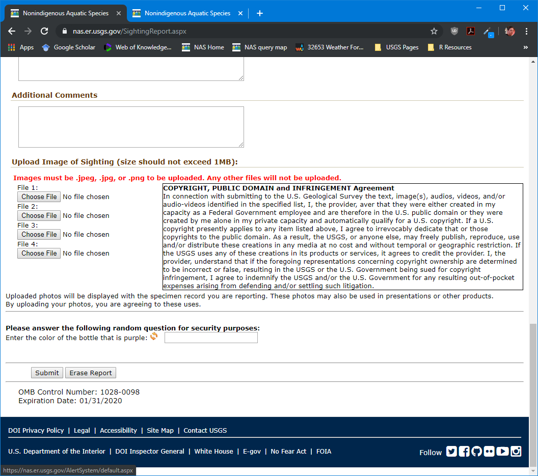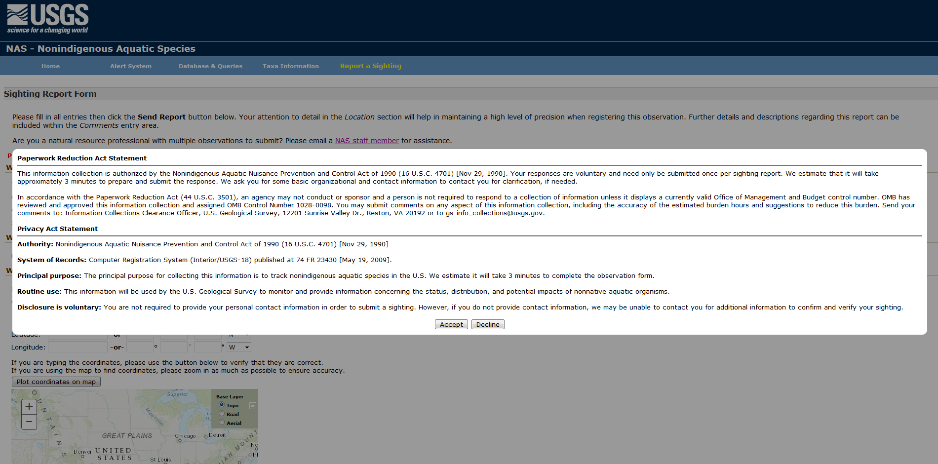 The NAS sighting report form (https://nas.er.usgs.gov/SightingReport.aspx) has both the OMB control number and expiration date contained in the document. On initial page load, the user is presented with an informational pop-up window containing the Paperwork Reduction Act and Privacy Act statements (see below).