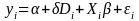 where yi reflects the outcome variable for an individual randomized i, which is modelled as potentially varying with whether she is offered the program Di (equal to 1 if i is offered the program, or 0 if she is a control), her background characteristics Xi (measured at randomization), and an idiosyncratic time-specific error i (assumed to be on average equal to 0). The parameter of interest is , the level difference in outcome y for those offered the program (D = 1), relative to those who are not (D = 0).