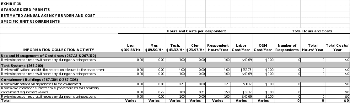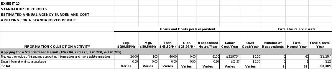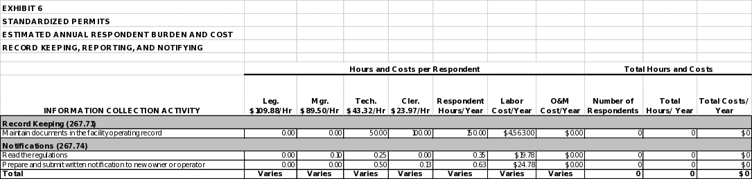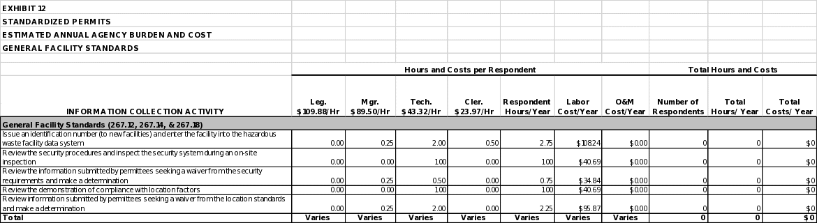 The original ICR for the standardized permit rule included estimate for the number of eligible facilities, and for facilities expected to apply for the standardized permit. Since the rule was promulgated in 2005, 12 states have received authorization for the rule (AR, ID, IL, IN, KS, MT, NV, OK, SD, TX, VA and WY) and only one facility has been issued a standardized permit. For the purposes of this ICR, EPA assumes that no facilities will be either applying for or reapplying for a standardized permit during the three-year period of this ICR.