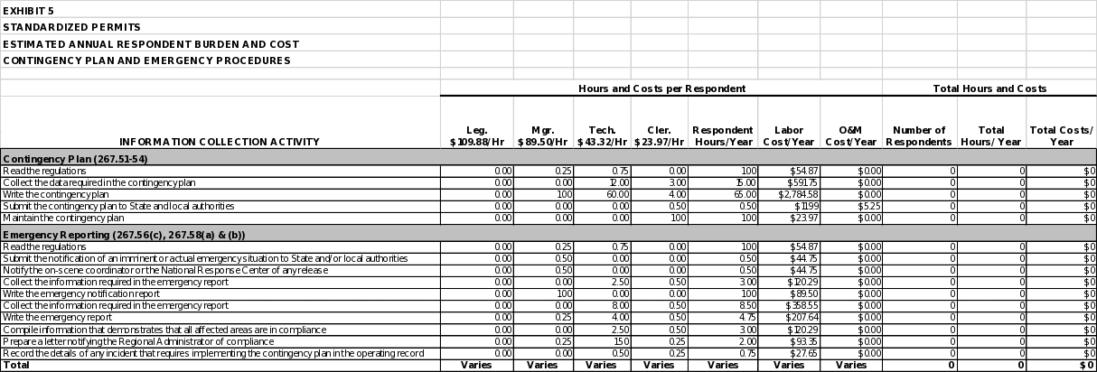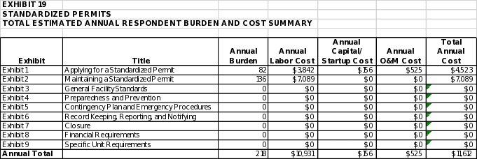 Exhibit 19 summarizes the total annual respondent burden and cost associated with all the requirements covered in this ICR. As shown in the exhibit, EPA estimates that the annual respondent burden to be approximately 218 hours, at an annual cost of $11,612. Annual capital/operation & maintenance costs are estimated at $525.