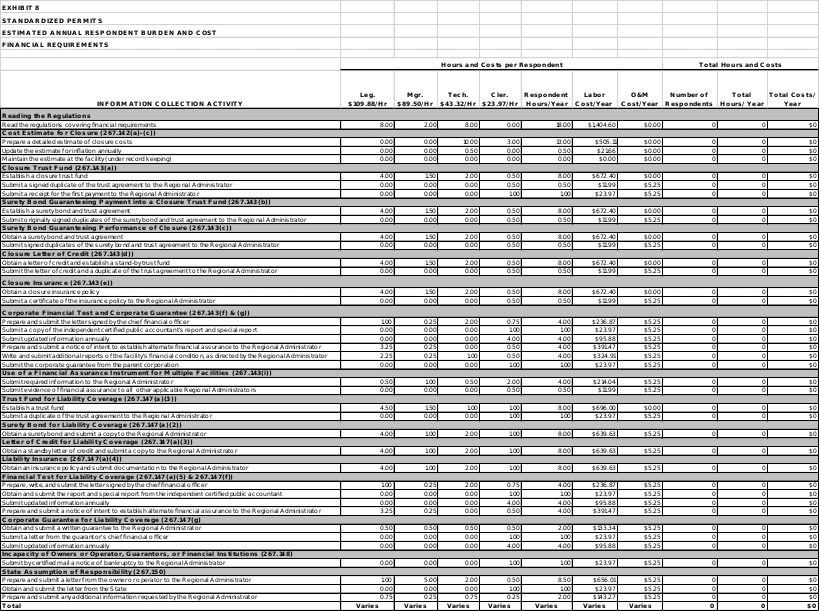 EPA estimates that each new facility will need to purchase one 5-drawer lateral file cabinet to maintain their application materials over the ten-year life of their permit.1 The current market price for such a file cabinet is $549. EPA has annualized this cost at a discount rate of 7 percent over ten years (based on the average life of the permit). Thus, EPA estimates the annualized net present value of this capital cost to be $78 per facility. In Exhibit 19, EPA has included the annualized capital cost for the two new facilities expected to apply for and obtain a standardized permit each year ($156 per year).