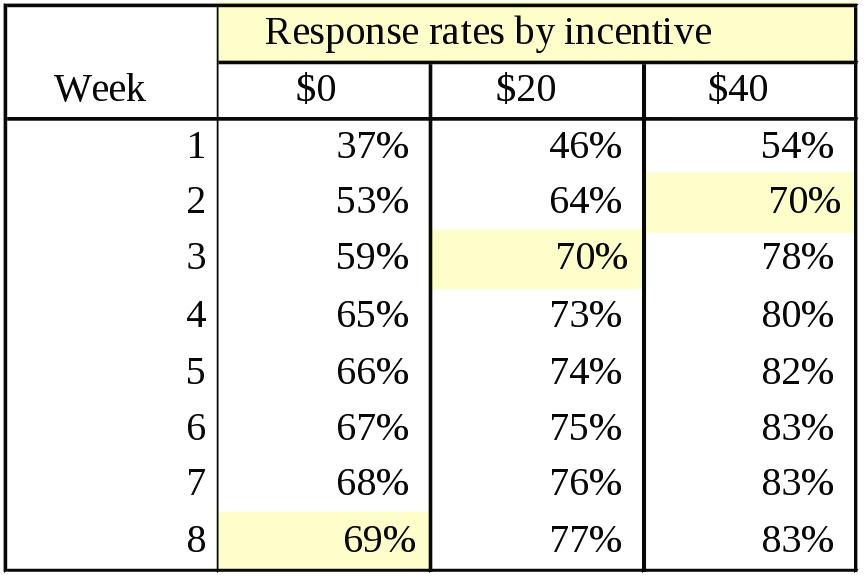 In the first 4 weeks of data collection, there was a substantial gain in response each week depending on incentive level. The gain in weeks 5-8 was small regardless of incentive level. The BLS 70% response rate target was reached in 2 weeks with $40 incentives, in 3 weeks at $20, and was not quite reached at 8 weeks with no incentive.