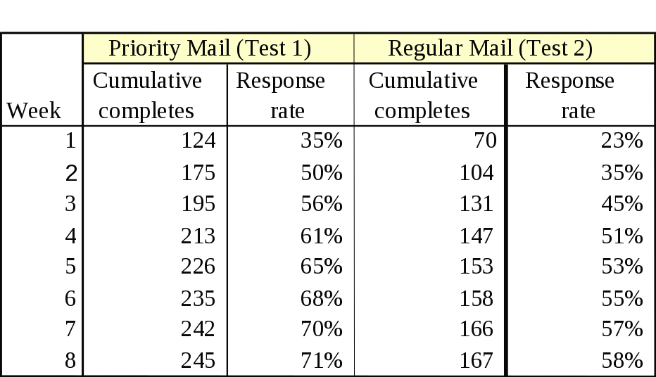 Standard of mail. Priority Mail appears to have had a substantial positive effect on response rates. It is relatively inexpensive to administer, particularly when compared to the costs of recycling and incentives. As a result, Priority Mail will be used for ATUS production.
