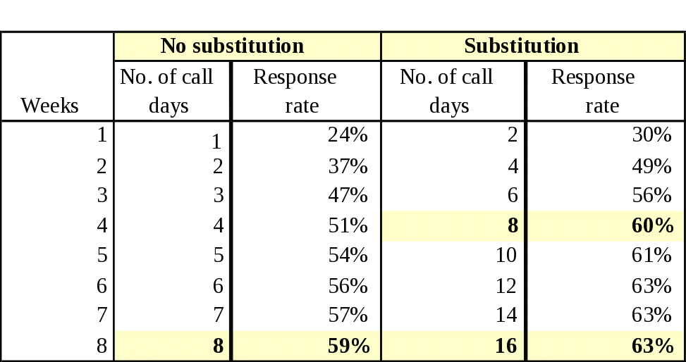 Substitution. Cases that used the substitution methodology had twice as many EIDs on which to complete the interview. As mentioned previously, substitution increased overall response from 59% to 63% (in Test 2) after 8 weeks. However, substitution also negatively affected day-of-week representation of responses.