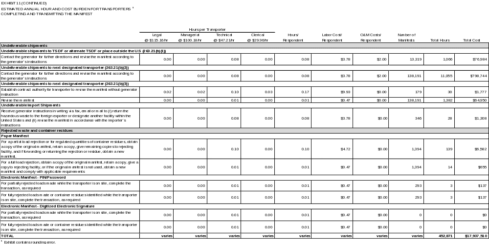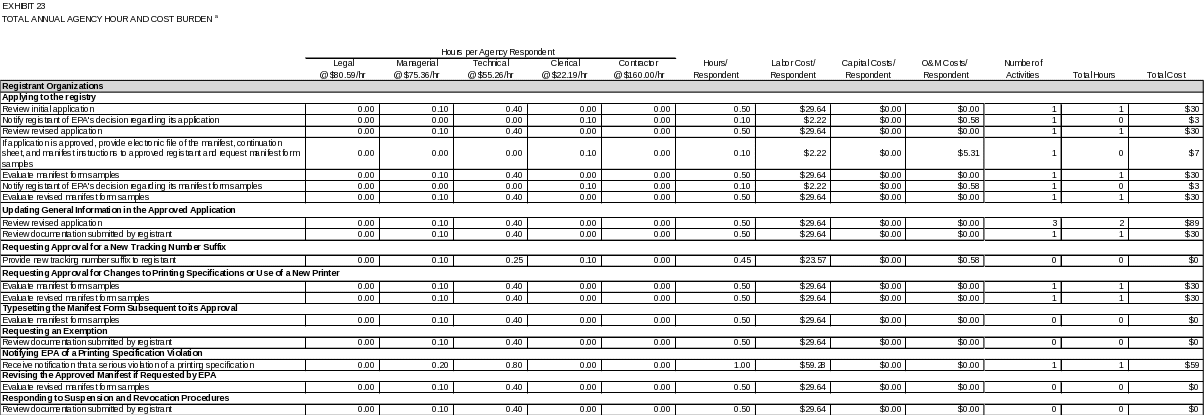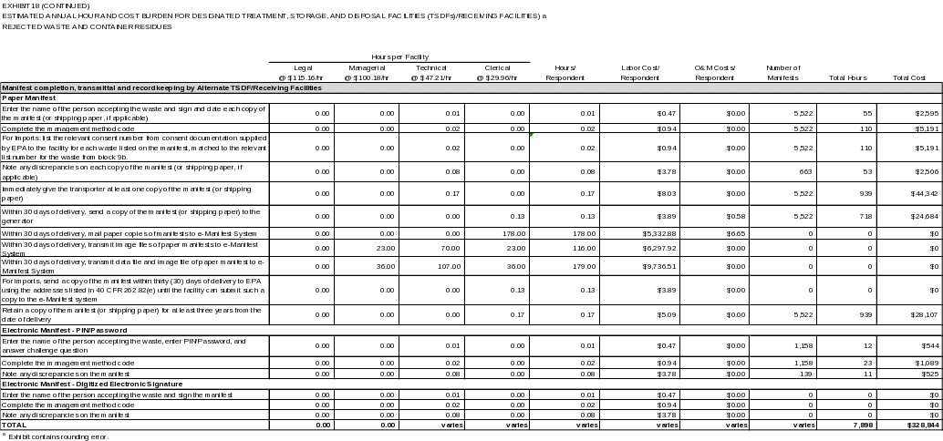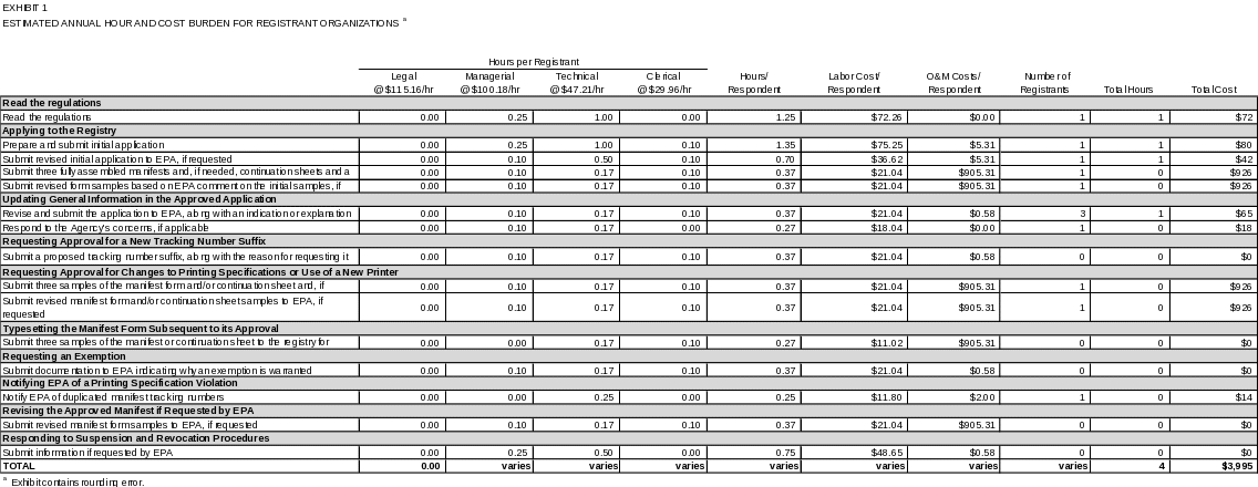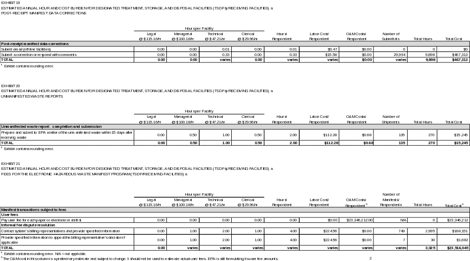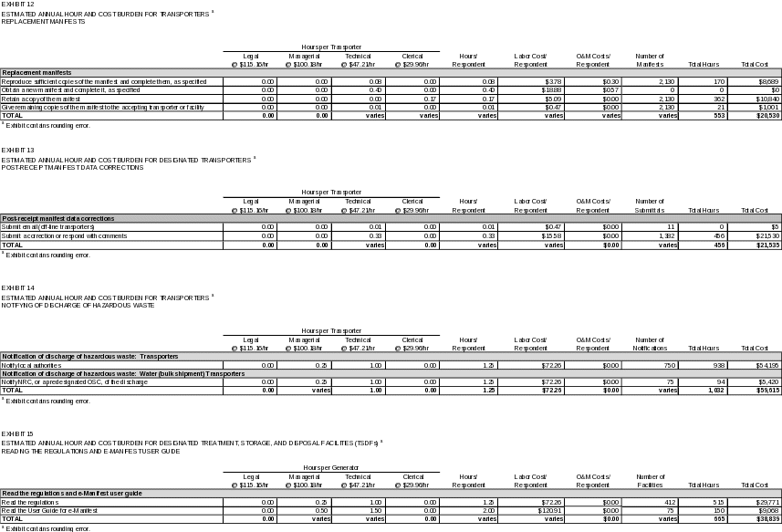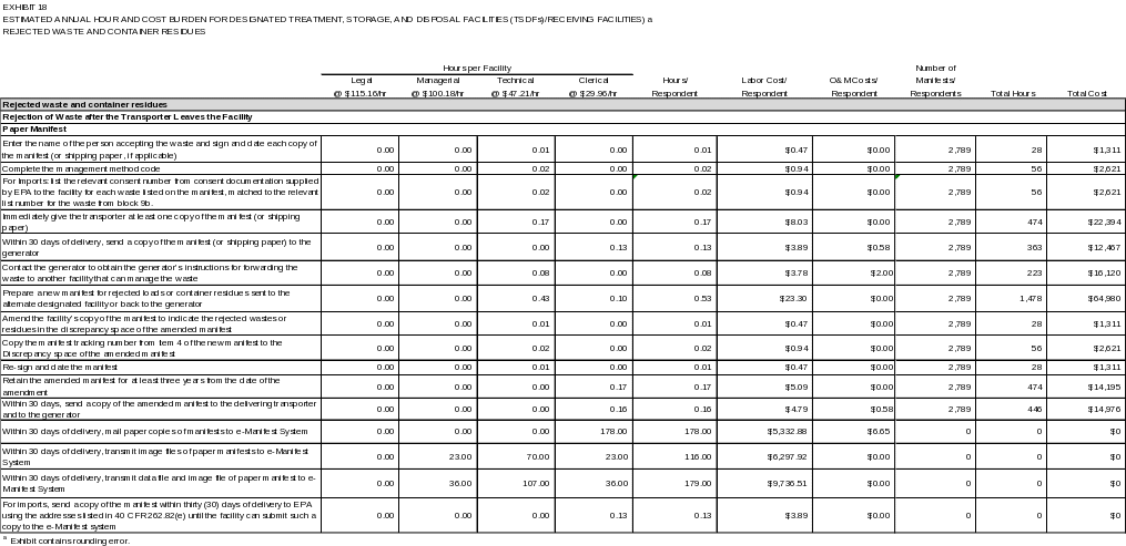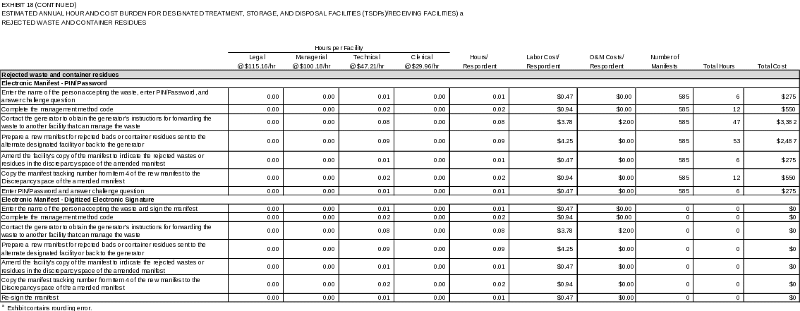 51 In other words, Exhibit 17 estimates submittal burden based on the number of facilities, not the number of manifests submitted. It is assumed that each facility will collect all manifests received during the month, including those accompanying imports, rejected loads and container residues, and submit them in batch form to the national system.