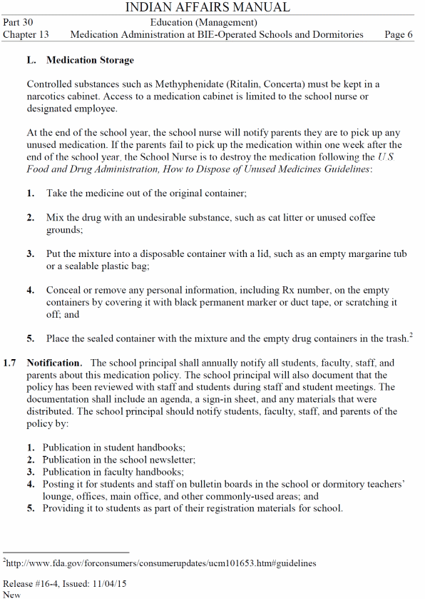 November 4, 2015, Memorandum: Medication Administration at BIE-Operated Schools and Dormitories