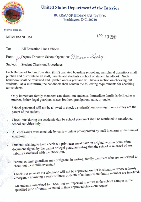 BIE Student Check-Out Procedures Memorandum dated April 13, 2010
