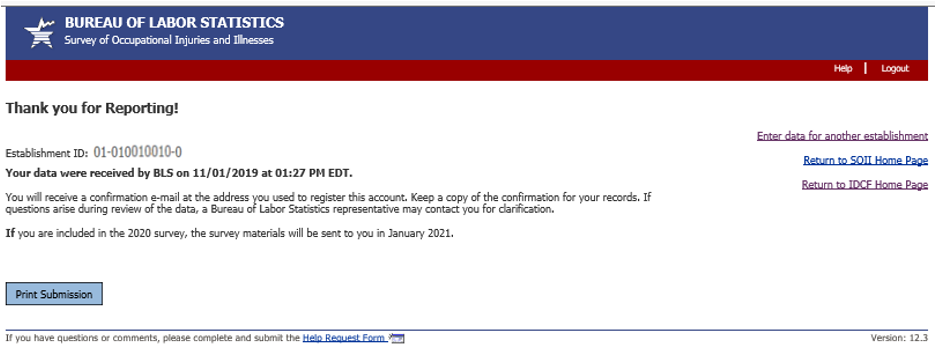 From screen above, or any screen within the survey, users can click on the “Help Request Form” link on the bottom of the page to send a question to the helpdesk. The Help Request Form is shown below. This year we added a Salutation drop down so that our helpdesk staff can address users properly: