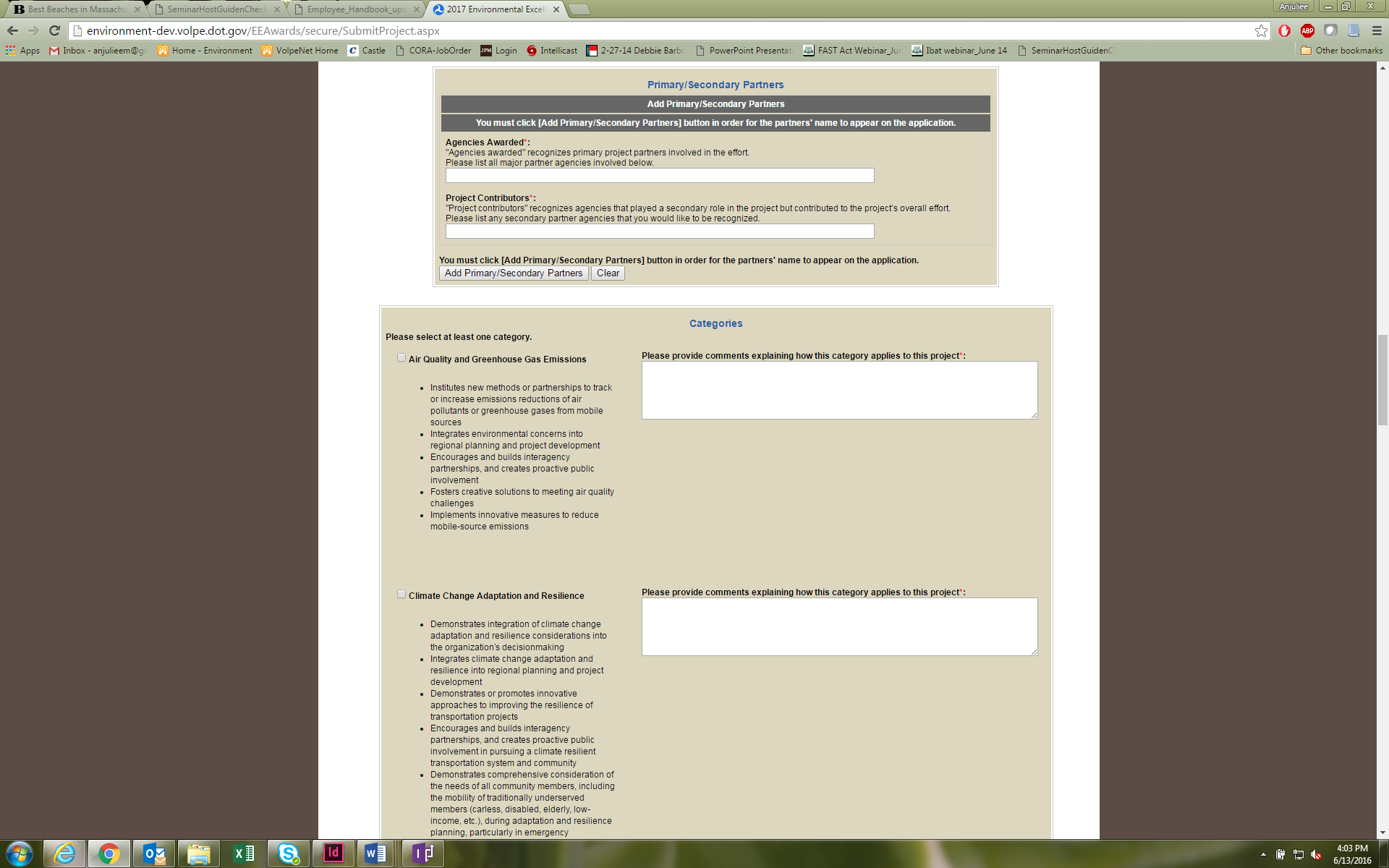 When submitting an application (Figures 2a-e), respondents will be required to summarize their project activities and accomplishments, “add location” and “add a nominee,” identify the State Department of Transportation and FHWA Division contact(s) for the nomination, as well as to provide a preliminary list of the primary and secondary partners involved in the nominated project. Respondents may also upload images as part of their application. When a respondent is ready to submit an application, he or she will select “Preview Application” at the bottom of the page (Figure 5e). Respondents will be required to complete any missing fields before proceeding and submitting their application.