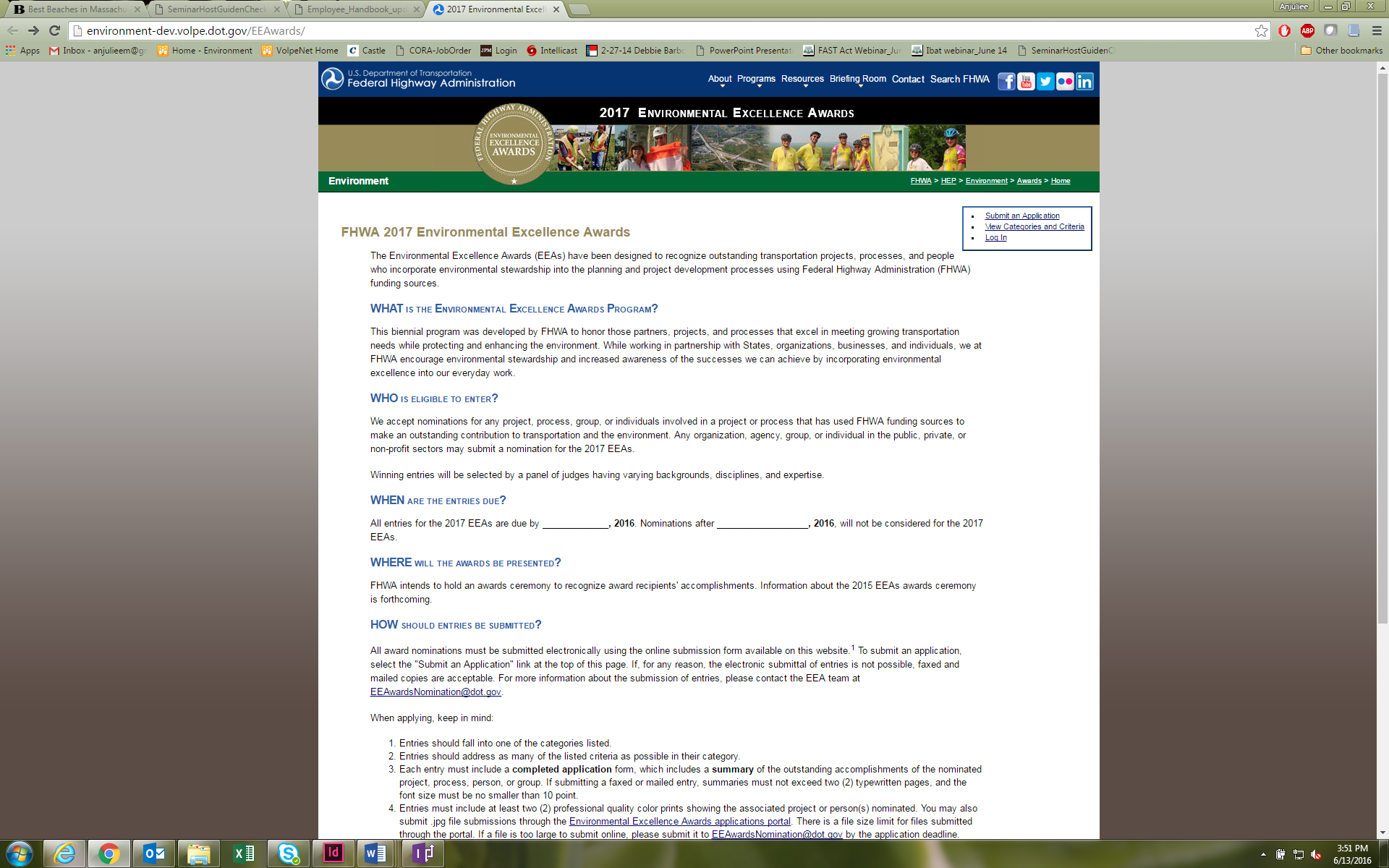 The process to nominate agencies, individuals, projects, and processes for FHWA’s Environmental Excellence Awards is described in detail here. Anyone may submit a nomination.