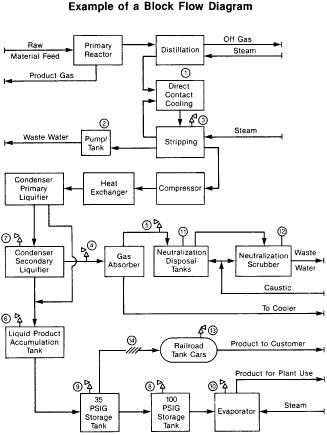 A block flow diagram is used to show the major process equipment and interconnecting process flow lines and show flow rates, stream composition, temperatures, and pressures when necessary for clarity. The block flow diagram is a simplified diagram.