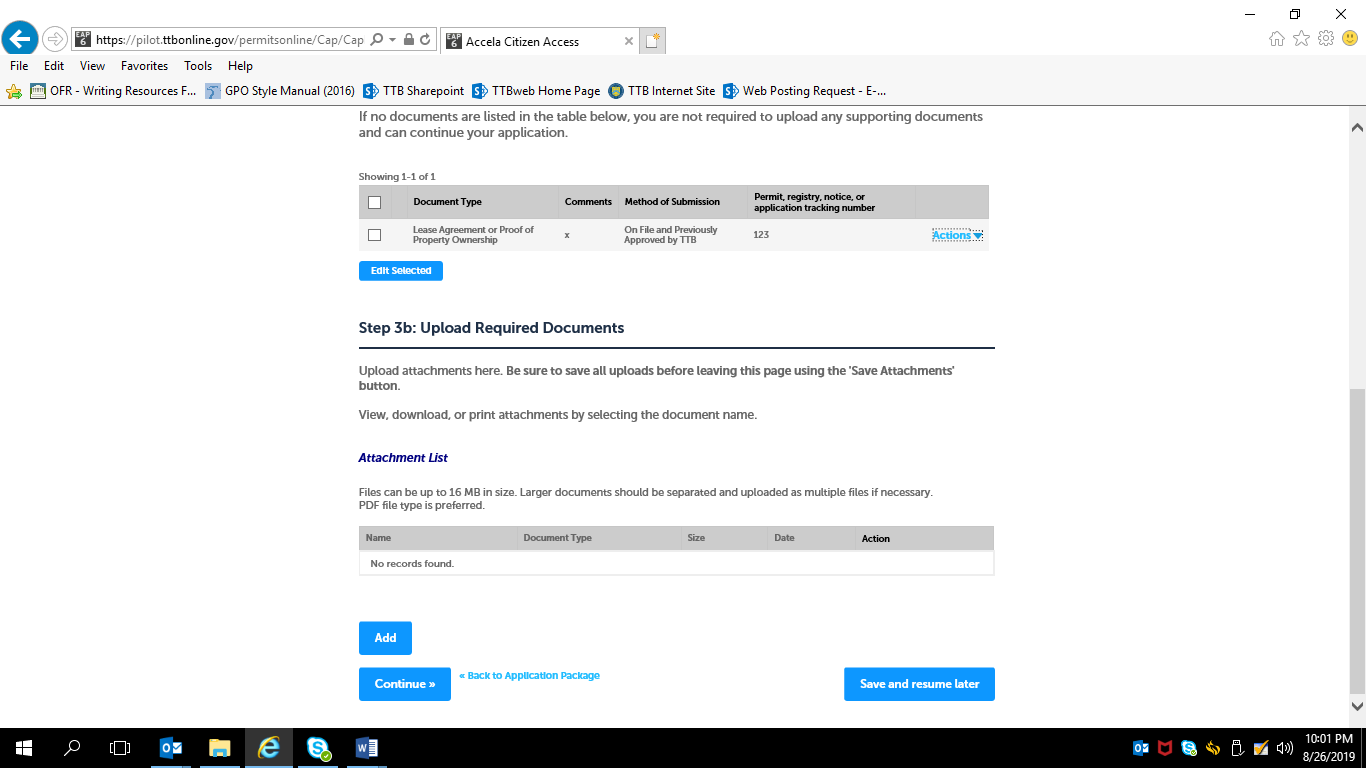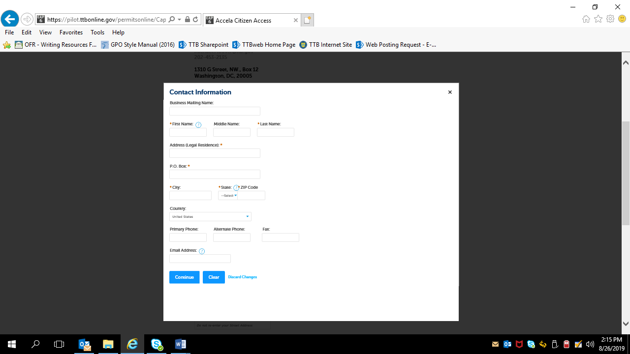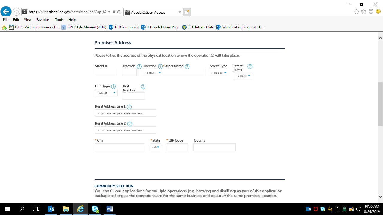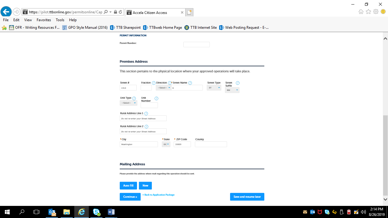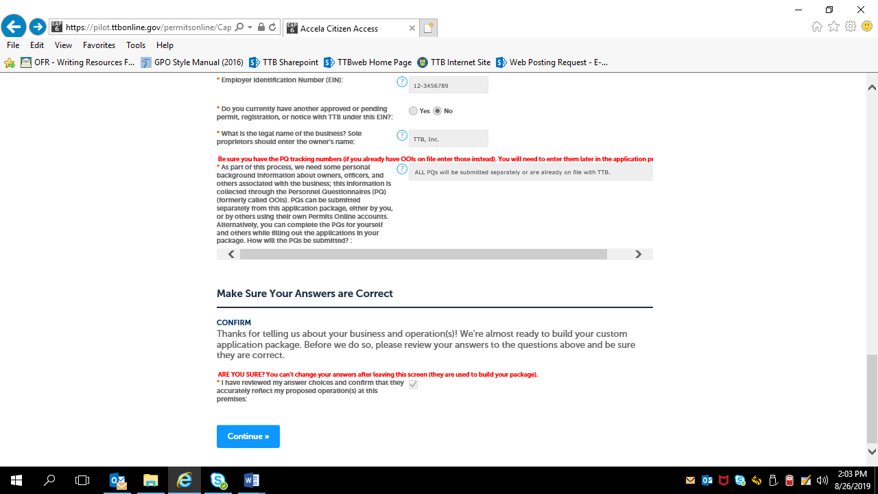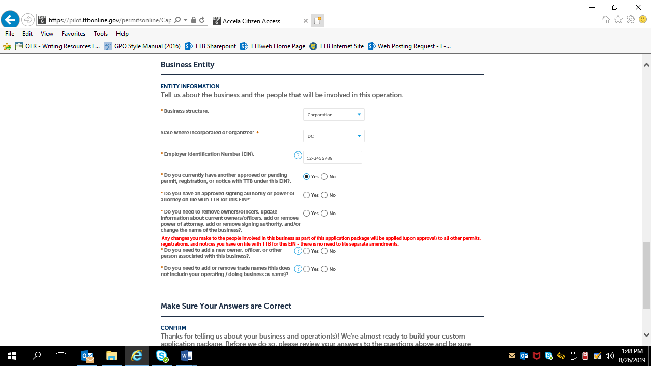 Answering “No” to “Do you currently have another approved or pending permit, registration, or notice with TTB under this EIN?” results in the data fields shown below --