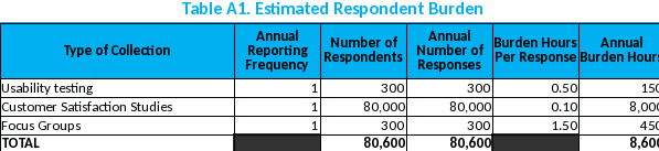 A variety of instruments and platforms will be used to collect information from respondents. The annual burden hours requested are based on the number of collections we expect to conduct over the requested period for this clearance. The total burden hours requested is 25,800 and 241,800 responses. The estimate of total burden hours and responses are based on the number of collections we expect to conduct over the requested three year approval period for this clearance.