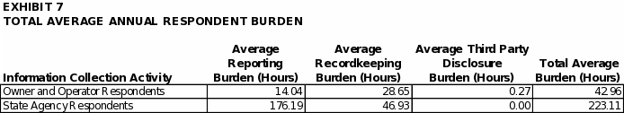Exhibit 7 presents the average annual respondent time burden for each UST facility and for each state that has a federally approved UST program or will apply for program approval. For UST facilities, as shown in the exhibit, the estimated total average time burden for conducting the activities covered in this ICR is approximately 43 hours per respondent annually. Of this total, the reporting burden is estimated to average 14 hours per respondent per year. This estimate includes time for preparing and submitting notices, preparing and submitting demonstrations and applications, reporting releases, gathering information, and preparing and submitting reports. The estimated average recordkeeping burden for UST facilities is 29 hours per respondent per year. This estimate includes time for gathering information and for developing and maintaining records. The burden for third-party disclosure is estimated to average 0.3 hours per respondent per year. This estimate includes time to notify an UST purchaser of the owner’s notification obligations.