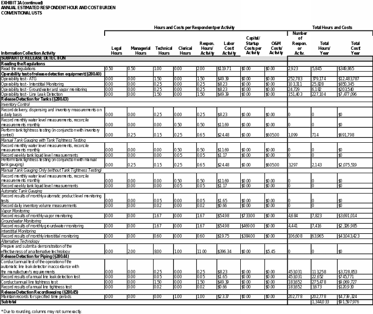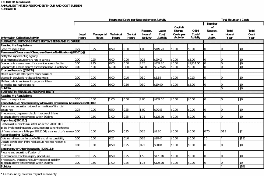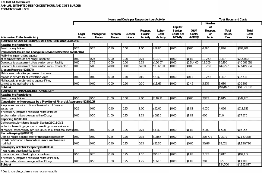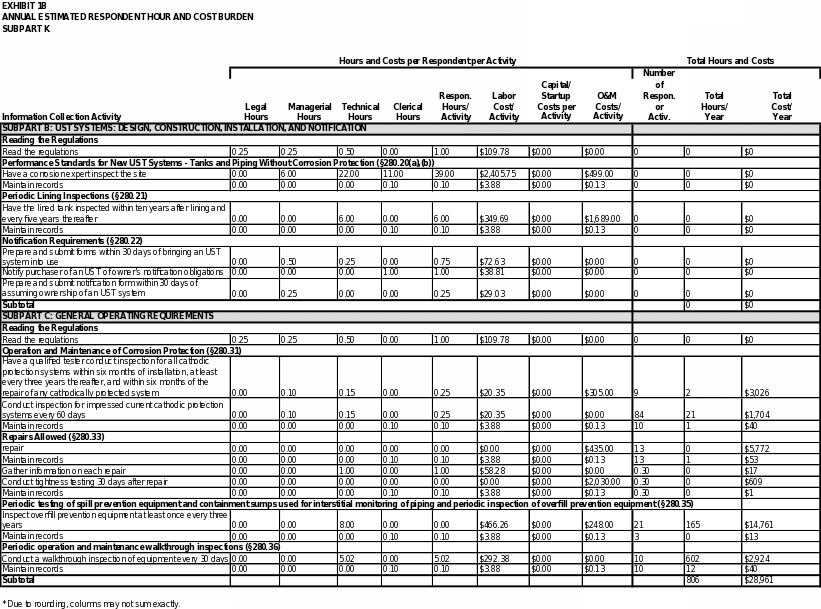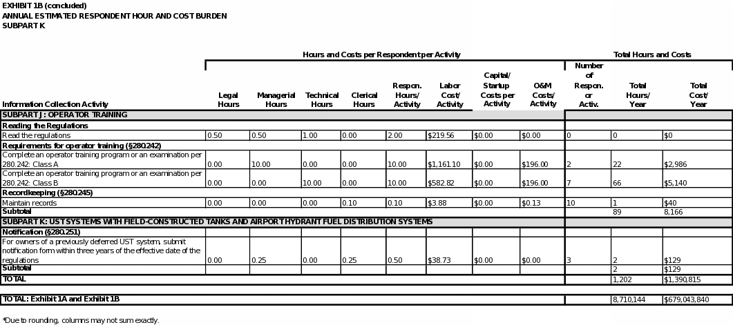 Exhibit 5 summarizes the total annual hour and cost burden to UST owners and operators and to states. As shown in the exhibit, EPA estimates the annual respondent burden to be approximately 8,720,000 hours and $680 million. The bottom line burden to respondents over three years is estimated to be approximately 26 million hours and approximately $2.0 billion.