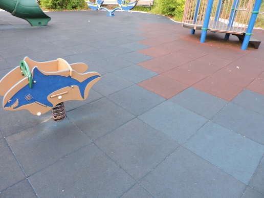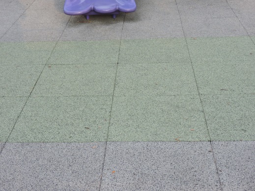 Description: Smooth rubber surface made of tiles with obvious seams between individual tiles. They may be colored to make patterns or designs. The rubber tiles on playgrounds are most commonly square, but they also come in other shapes (not shown).