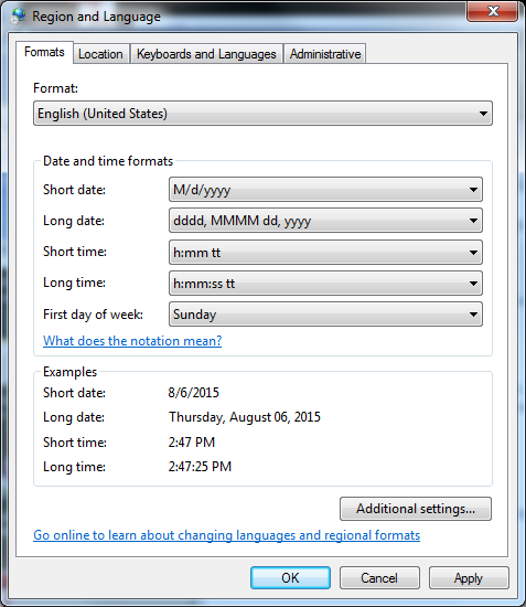 Change the Format from your existing one (e.g. “Italian (Italy)”) to “English (United States)” (see screen shots below)